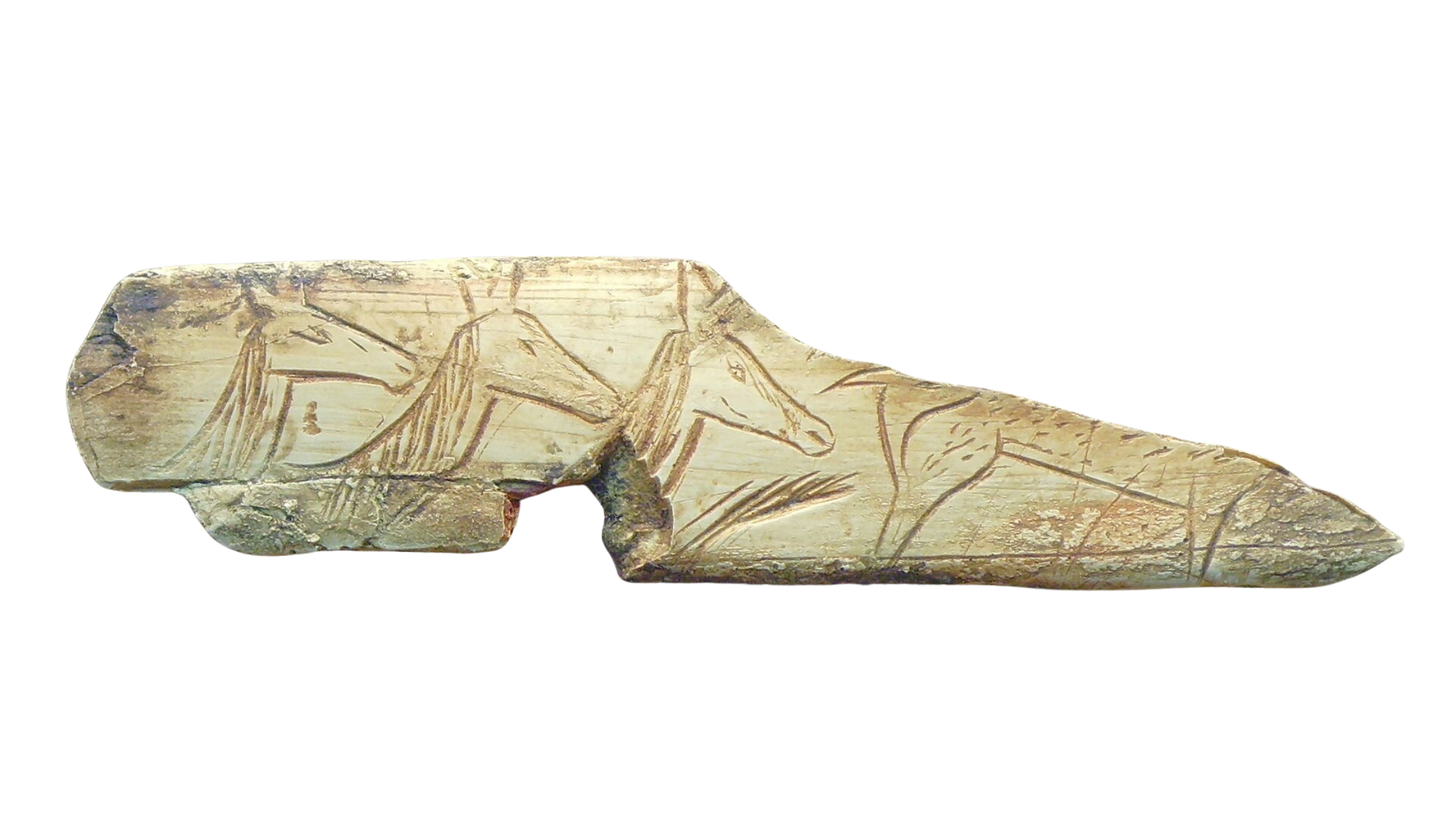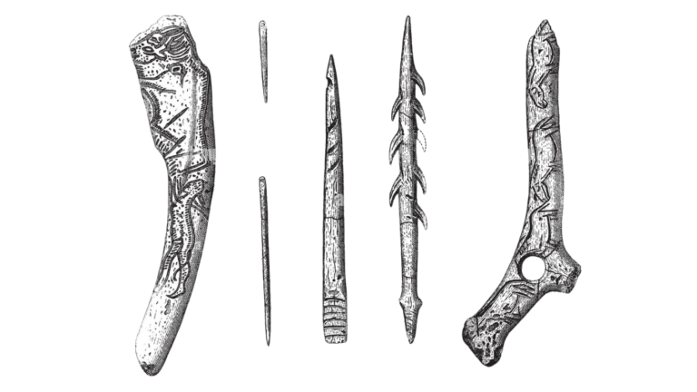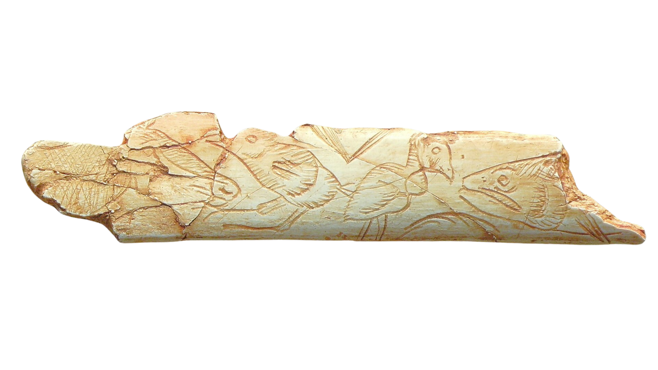Magdalénien IV – Spitzen aus Rentierknochen mit seitlichen Kerben (Vorläufer von Harpunen), kleine, teils verzierte Knochenrondelle.