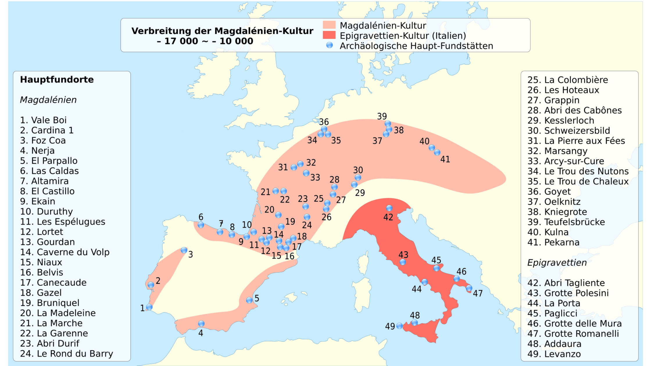 Das Magdalénien ist eine archäologische Kultur des späten Jungpaläolithikums, die hauptsächlich mit Europa verbunden ist, insbesondere mit Frankreich, Spanien und Teilen Mitteleuropas. Diese Kultur ist nach der Fundstätte La Madeleine in Frankreich benannt, wo einige der charakteristischen Artefakte entdeckt wurden.