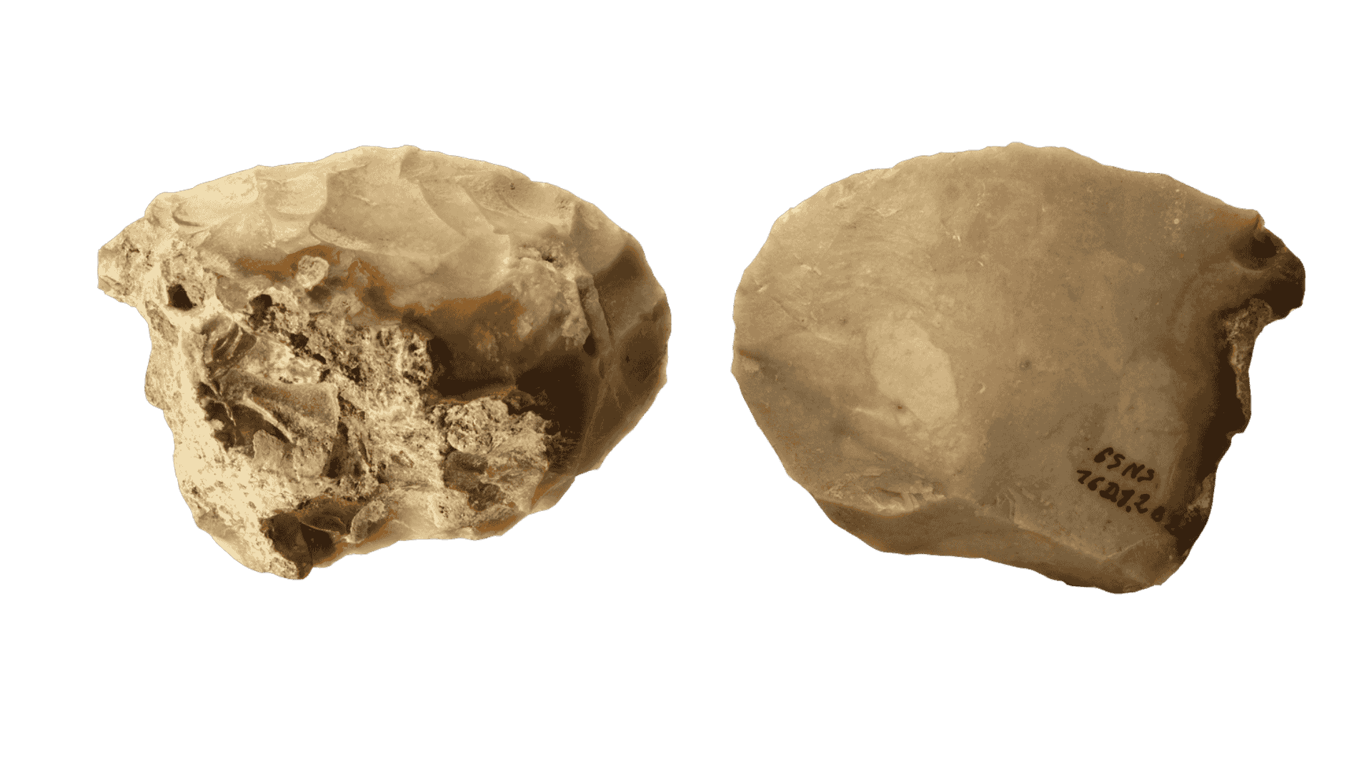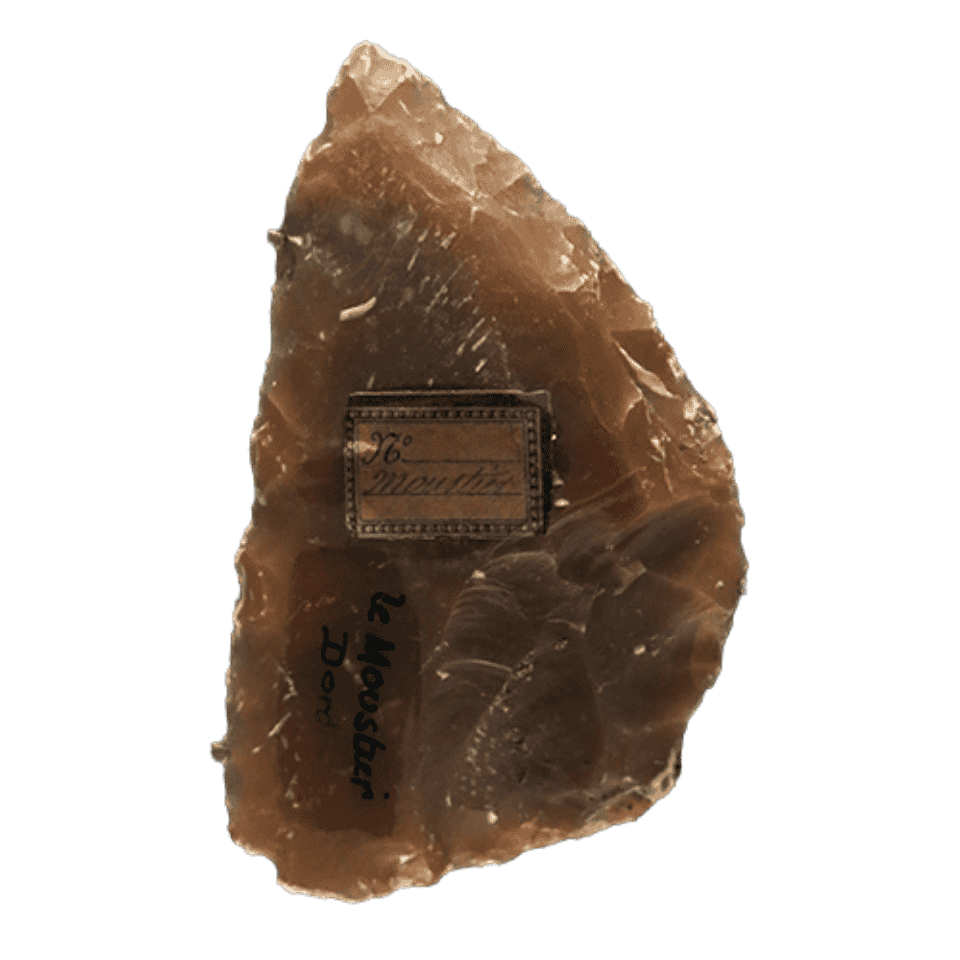 - Typisches Moustérien:Viele Schaber, gelegentliche Spitzen, definiert durch Abwesenheit von Faustkeilen/gezähnten Klingen