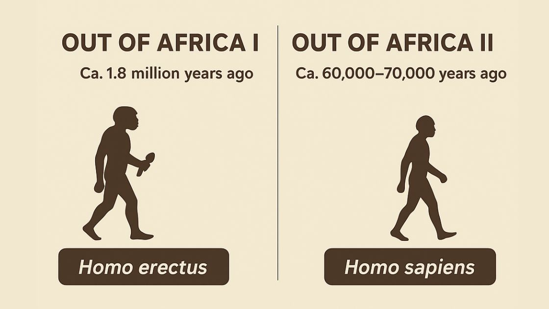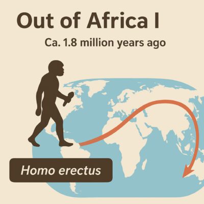 - „Out of Africa 1“ beschreibt die erste Auswanderung von frühen Vorfahren des Menschen (Gattung Homo).